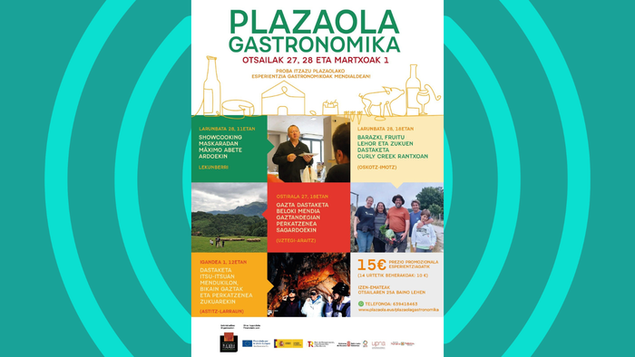 Asteburu honetan "Plazaola Gastronomika", lau esperientzia gastronomiko antolatu dituzte baita gurean ere. Ostiral arratsaldean gazta dastaketa izanen da lehena Uztegin, Araitzen, Beloki Mendia Gaztandegian, Perkatzenea sagardoekin. Hurrengo goizean, 11:00tan Lekunberriko Maskaradan "Showcooking" Máximo Abete ardoekin. Eta igande goizean 12:00tan Mendukilon, Astitzen dastaketa itsu-itsuan Bikain Gaztak eta Perkatzenea zukuekin.