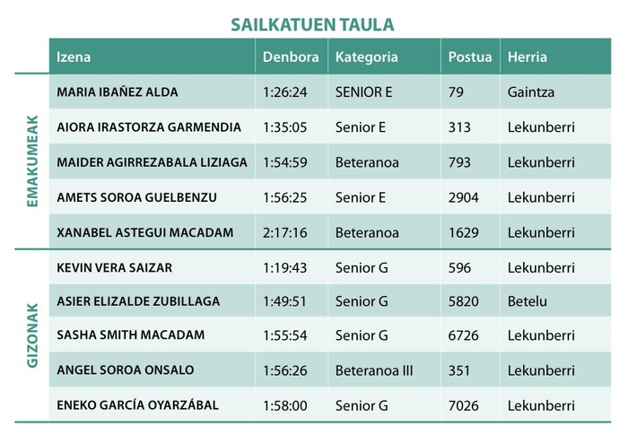 Araitz, Betelu eta Lekunberriko sailkatuen taula.