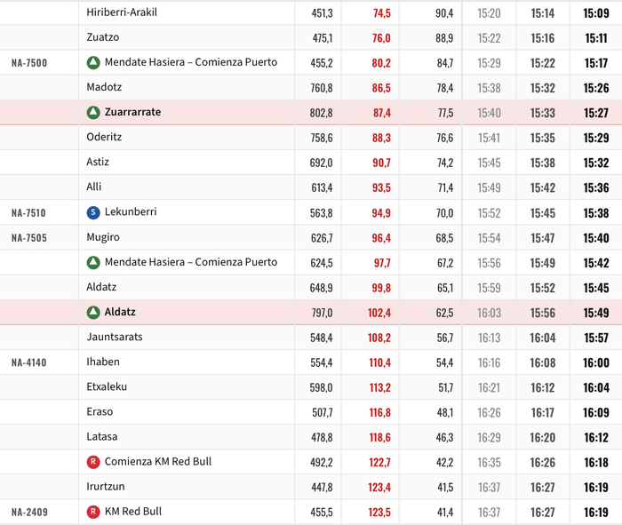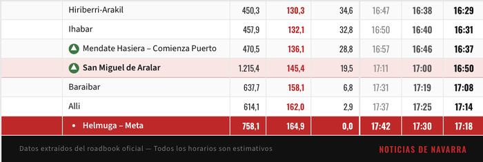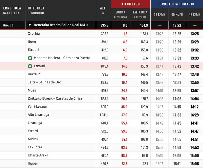 Gure inguruko puntu garrantzitsuenetako bat Lekunberriko “sprint berezia” izango da (94. kilometroaren inguruan), eta pelotoia 15:30 – 16:00ak aldera iristea espero da (gutxi gorabeherako ordutegia). Handik aurrera, Irurtzunerantz jarraituko dute eta ondoren San Migel Aralarrera igoko dira.