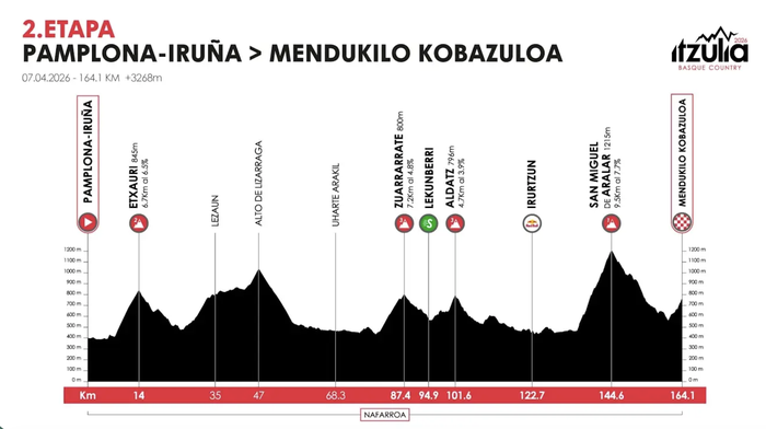 Bigarren etapa Iruñean hasiko da eta 164 kilometroko ibilbidea izango du. Halaber, txirrindulariak arratsalde partean iritsiko dira eskualdera, mendiko etapa gogorra gainditu ostean.